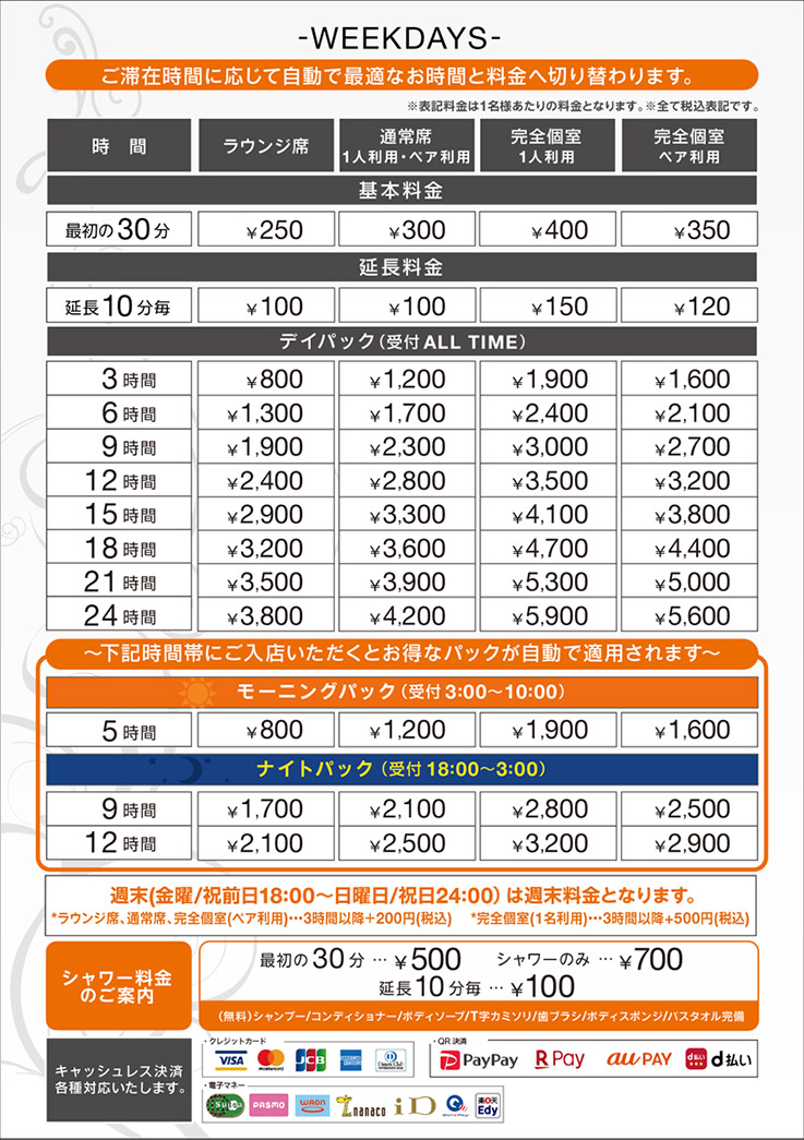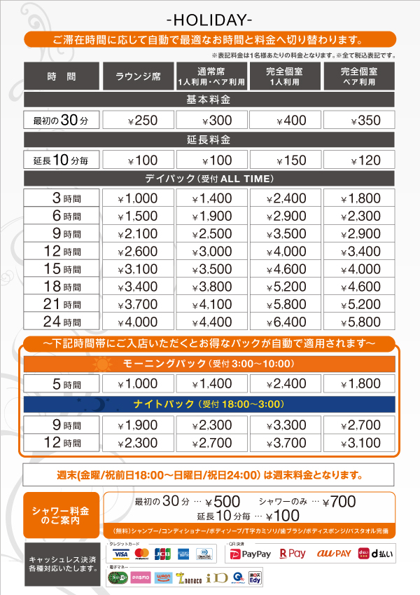 最初の30分間は500円(シャワーのみの場合は700円)でご利用いただけます。。